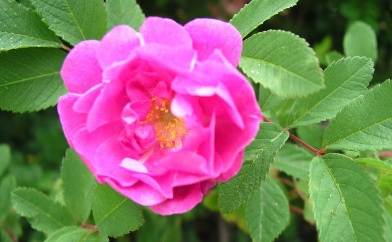 This perennial, shrubby plant has stout and branched stems growing up to 2 meters high, although it does not reach this height in wild lowbush blueberry fields. The upper branches are smooth except for scattered thorns. These thorns are stout, flattened at the base and somewhat curved. The leaves are compound and divided into 7 or 9 dark green, shiny leaflets. The leaflets are oblong (2 to 4 times as long as wide with parallel sides) to oval (often more than half as wide as long), with coarse teeth along the margin. The flowers, with pink petals and many yellow stamens in the centre, are solitary or in small clusters and are 5 to 8 cm in diameter. The plant does not flower in its first year of growth. The fruit is a bright red, many seeded, berry-like rose hip. This plant is extremely variable in all characteristics